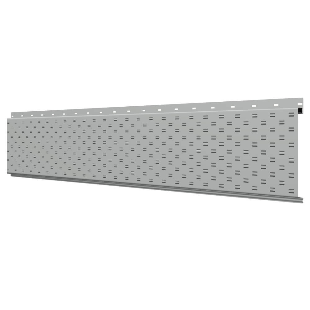 Линеарная потолочно-стеновая панель с ПЕРФОРАЦИЕЙ для вентиляции цвет RAL9006 Серебро применяется в качестве софитов для подшивы крыши, наружной и внутренней отделки потолков, стен, фронтонов фасада дома в Владимире.