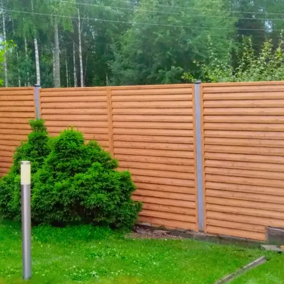 Двусторонний горизонтальный секционный забор с ламелями «Реснички» в цвете под дерево Кипарис с покрытием Printech (Корея). Особенность конструкции заключается в том, что при использовании одностороннего декоративного покрытия достигается эффект двусторонней эстетики: забор выглядит одинаково аккуратно и привлекательно с обеих сторон. Благодаря этому ограждение не только выполняет свои практические функции, но и становится стильным элементом ландшафта, создавая гармоничный вид и со стороны улицы, и со двора.