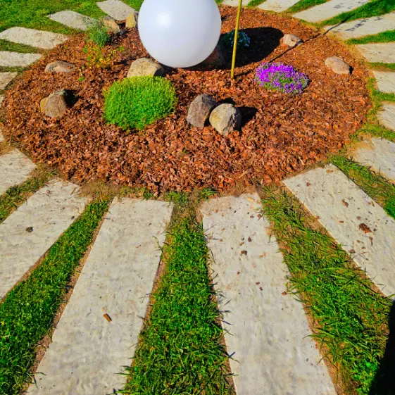 Обустройство садовой дорожки с использованием пошаговой плитки Stone крупноформатного мощения в оттенке Светлая Галька размером 990х330х55 мм. Благодаря вытянутой форме плит и гармоничному светлому тону дорожка выглядит стильно и современно, при этом органично вписывается в ландшафт. Крупные элементы создают ровный ритм движения, а гладкая поверхность обеспечивает удобство и безопасность при ходьбе. Такое решение не только подчёркивает эстетичность участка, но и делает функциональную зону прогулок максимально комфортной.
